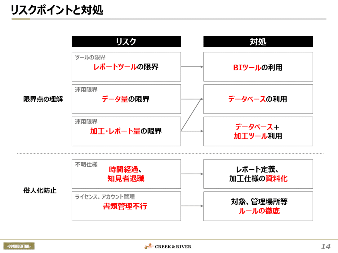 会社という組織でデータを活用する上で、「スモールスタートの重要性」と「その際に訪れるリスク」についてツールや運用、仕様等の観点からいくつか例を挙げ、どのように対処すべきかお伝えしました。