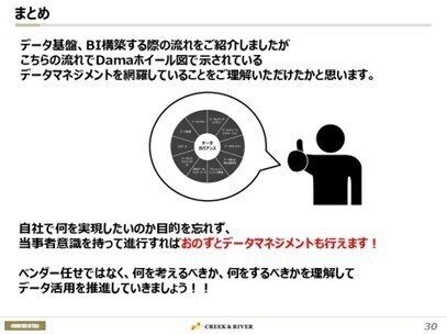 また、データの流れを理解していただいた上で、データ管理を開始するための思考プロセスを、システム構成、モデリング、セキュリティなどの側面からもお話ししました。