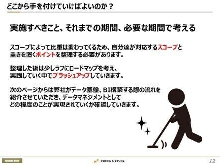 ここまでで知識体系をご理解いただいた上で、では実際に企業でデータを理・活用しようと思った時にどこから手を付けていけばよいのか?実施すべきこと、実施にあたって決めるべきことは?等考え方や進め方の例をここからご紹介していきました。