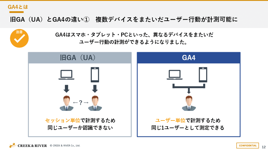 はじめに旧GA(UA)とGA4の違いを説明いたしました。違いの一つに複数デバイスをまたいだユーザー行動が計測可能になることを説明いたしました。