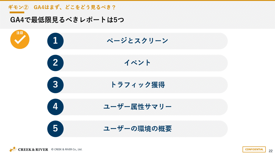 GA4の初期設定が終わった後、まずどの指標をみるべきでしょうか。本セミナーでは最低限見てほしい5つの指標を挙げ、それぞれの確認方法を丁寧に説明しました。