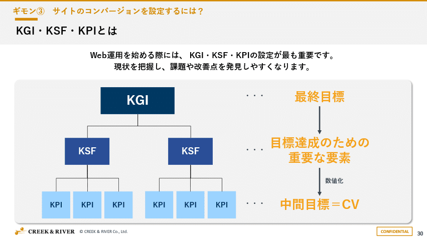 単にGA4での設定の仕方について説明するのではなく、コンバージョン設定の準備としてKGI・KSF・KPIを設定する重要性、KPIを作る方法として「KPIツリー」についても説明させていただきました。