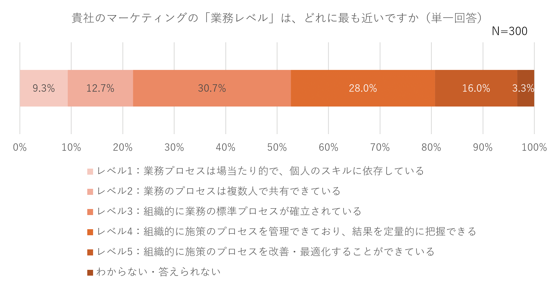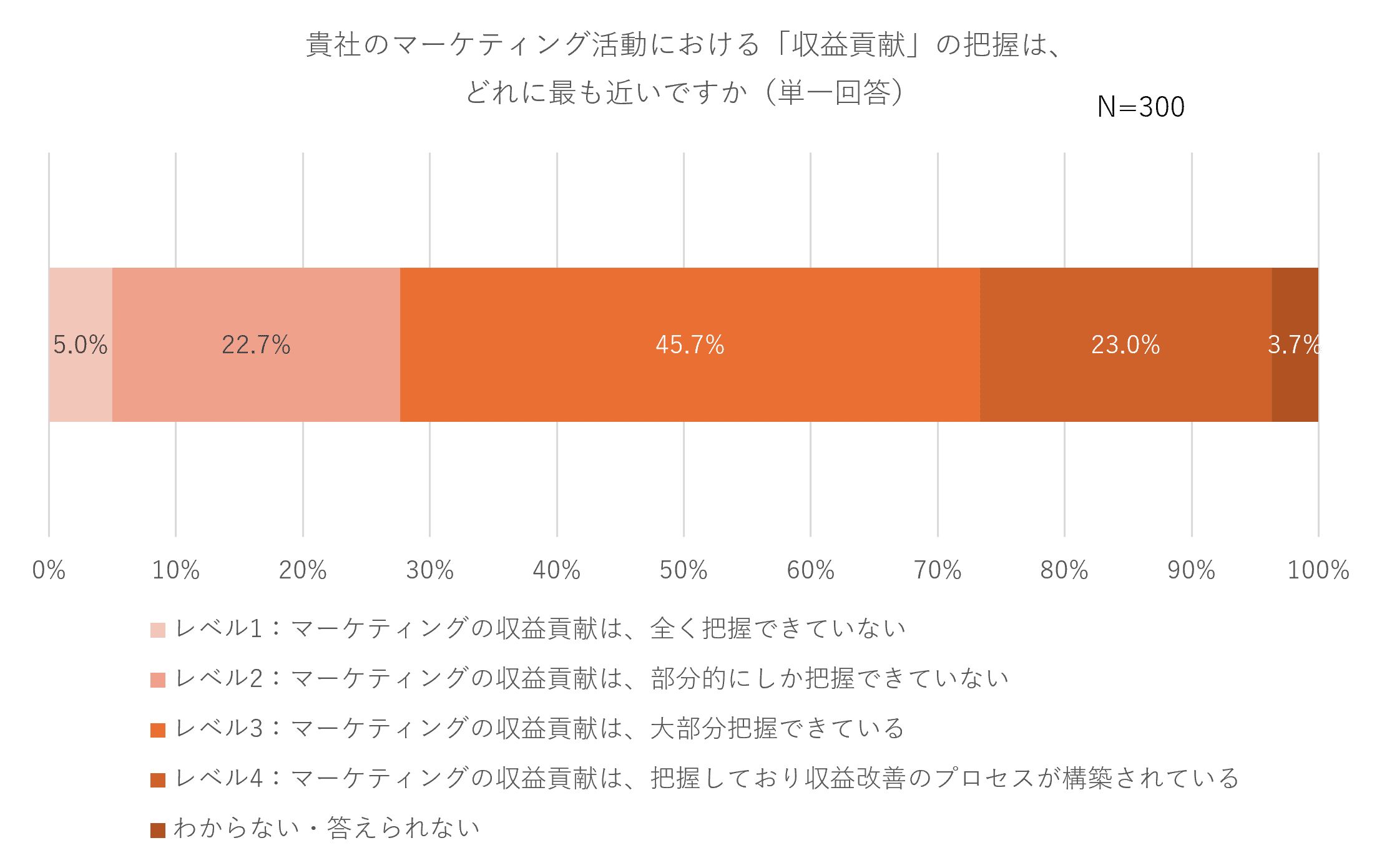 2023年2月に公開された株式会社パワー・インタラクティブの国内アンケート調査「MOps(マーケティングオペレーションズ)に関する実態調査」によると、アンケートに回答した年商50億円以上の企業に勤務するマーケティング責任者300人のうち、マーケティング活動において「収益貢献を把握しており収益改善のプロセスが構築されている」と回答したのは23%、「組織的に施策のプロセスを改善・最適化できている」と回答したのは16%と少数に留まりました。