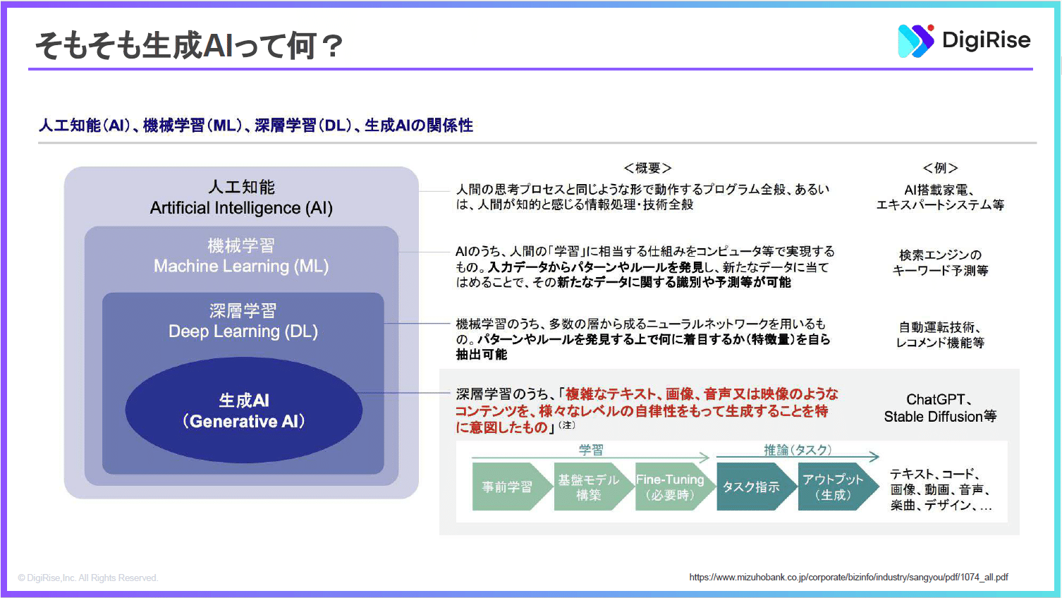 まずは「AI=生成AI」ではなくて、「AIの一部が生成AI」とご説明いただきました。機械学習という手法で、コンピュータに大量のデータから指定したアルゴリズムを元に特徴を発見させ、その特徴に基づいて最適化や推論、判断などを自動的に行うものです。本ウェビナーでは、機械学習の中の深層学習という手法で「複雑なテキスト、画像、音声または映像のようなコンテンツを、様々なレベルの自律性を持って生成することを特に意図したもの」を「生成AI」と定義づけました。