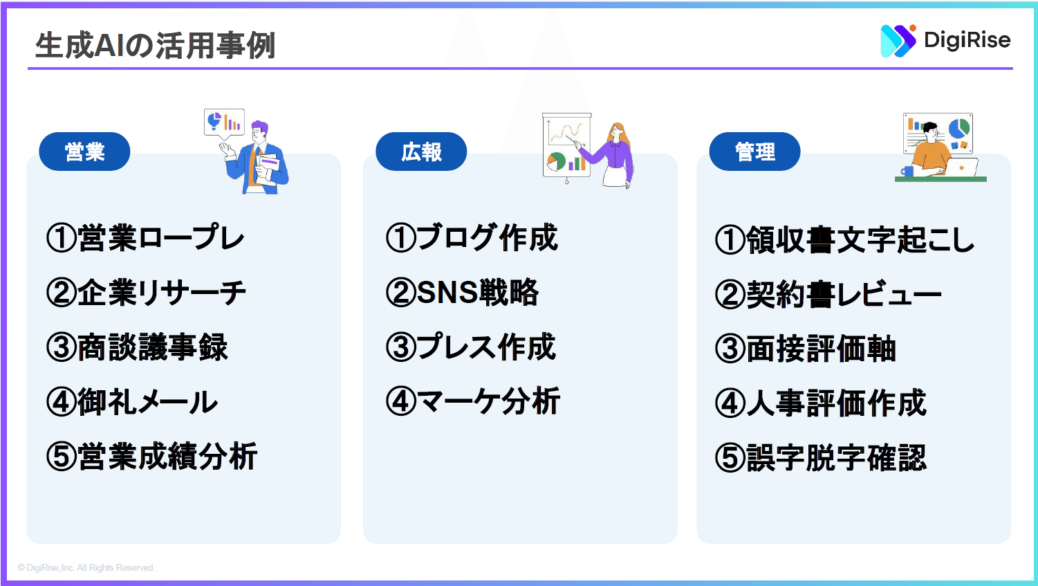 生成AIの活用で業務効率化ができそうな具体的なイメージがわいたのではないでしょうか? 当社でも生成AIの導入・活用方法に関してご支援をさせていただいております。