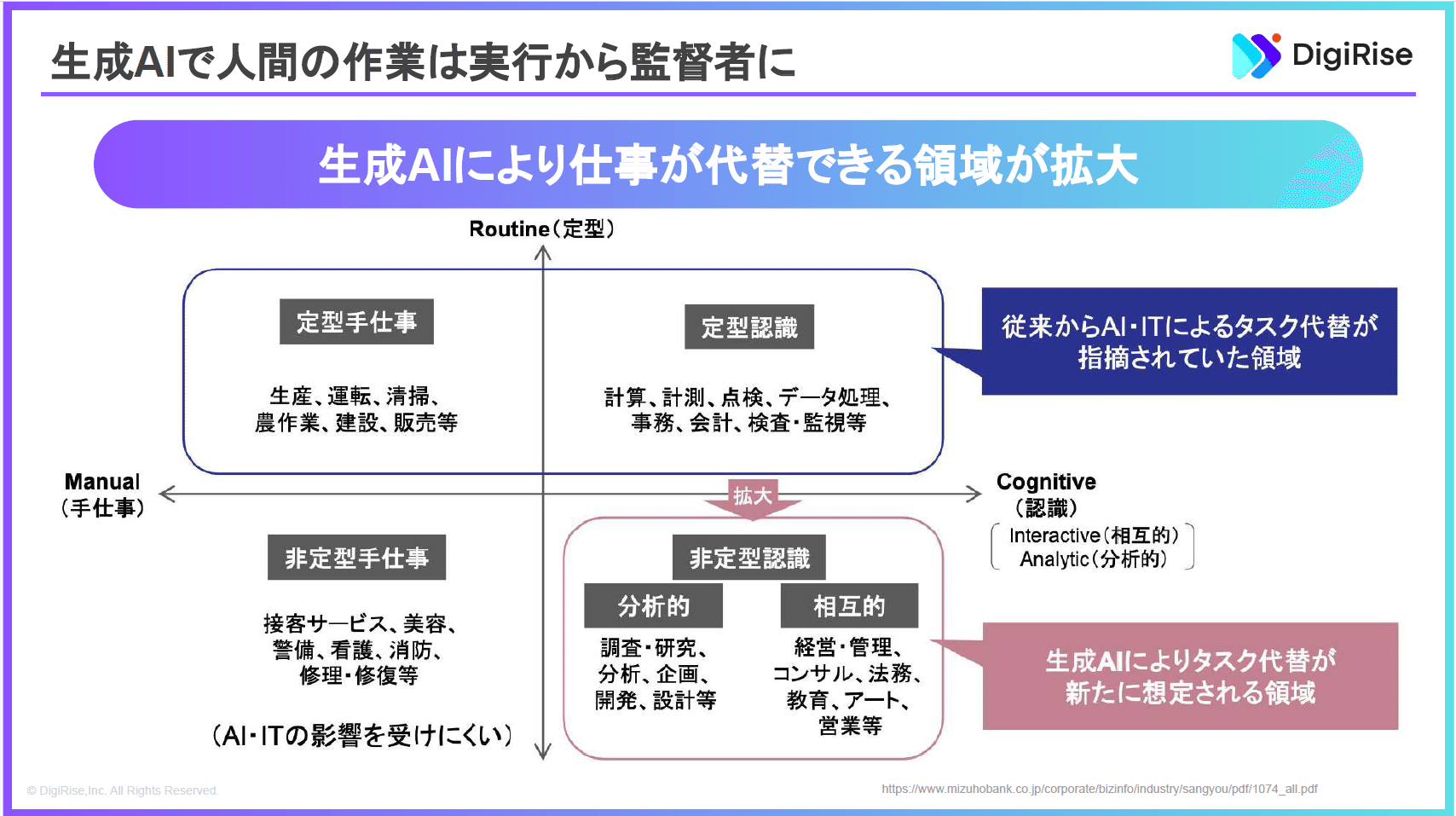 次に、生成AIができることを大きく分類すると、テキスト生成、画像・動画生成、コード生成、音声・楽曲生成、その他に分類されます。AIの登場により、人間の働き方もずいぶん変化しました。従来はAIやITを活用して、主にルーティンのタスクを代替していましたが、生成AIは型にはまった業務だけではなく、より柔軟なものにも対応することができます。