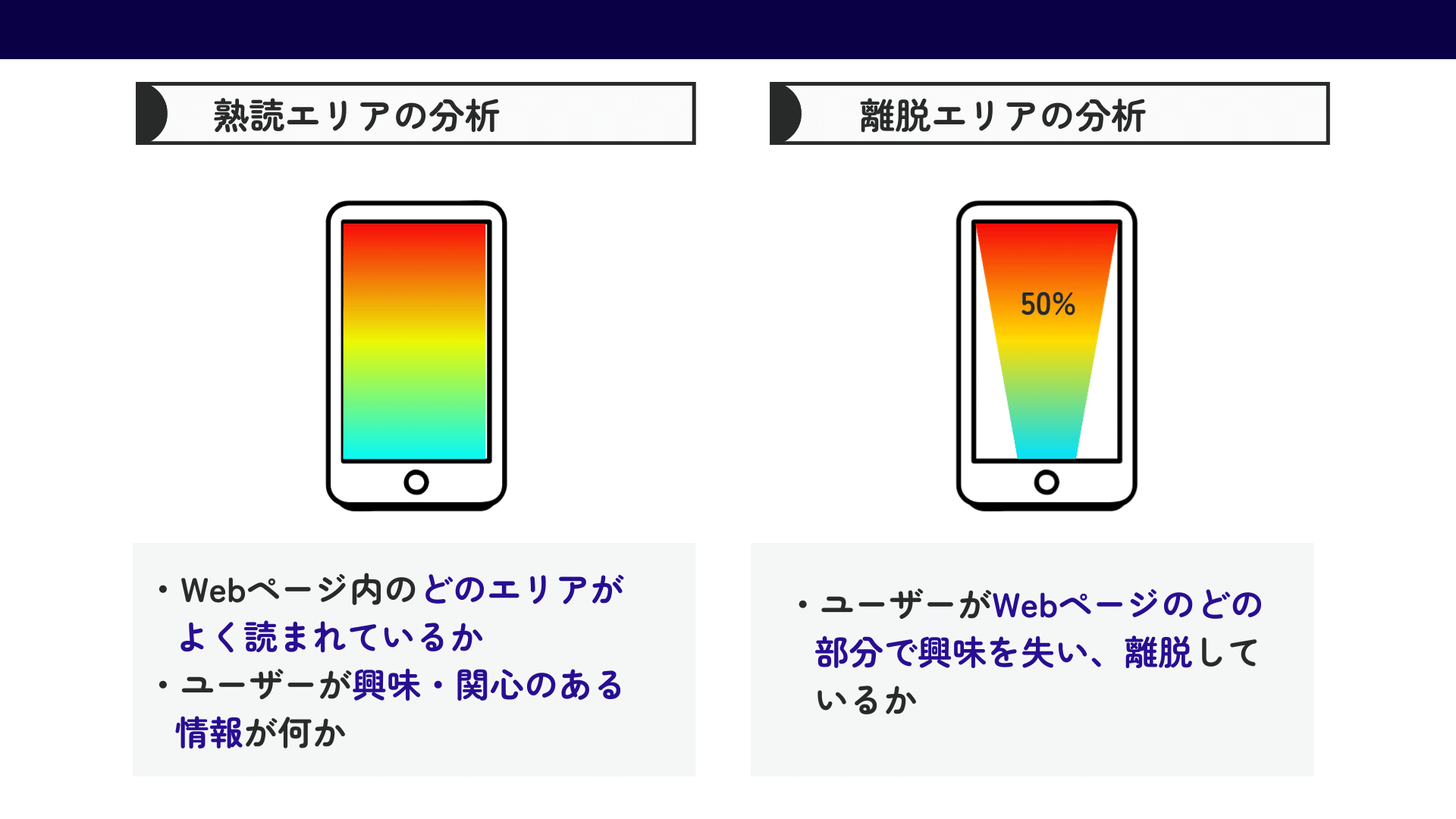 何パーセントのユーザーがどこまで画面をスクロールしているかを表現した分析手法で、ポイントは50%のラインです。