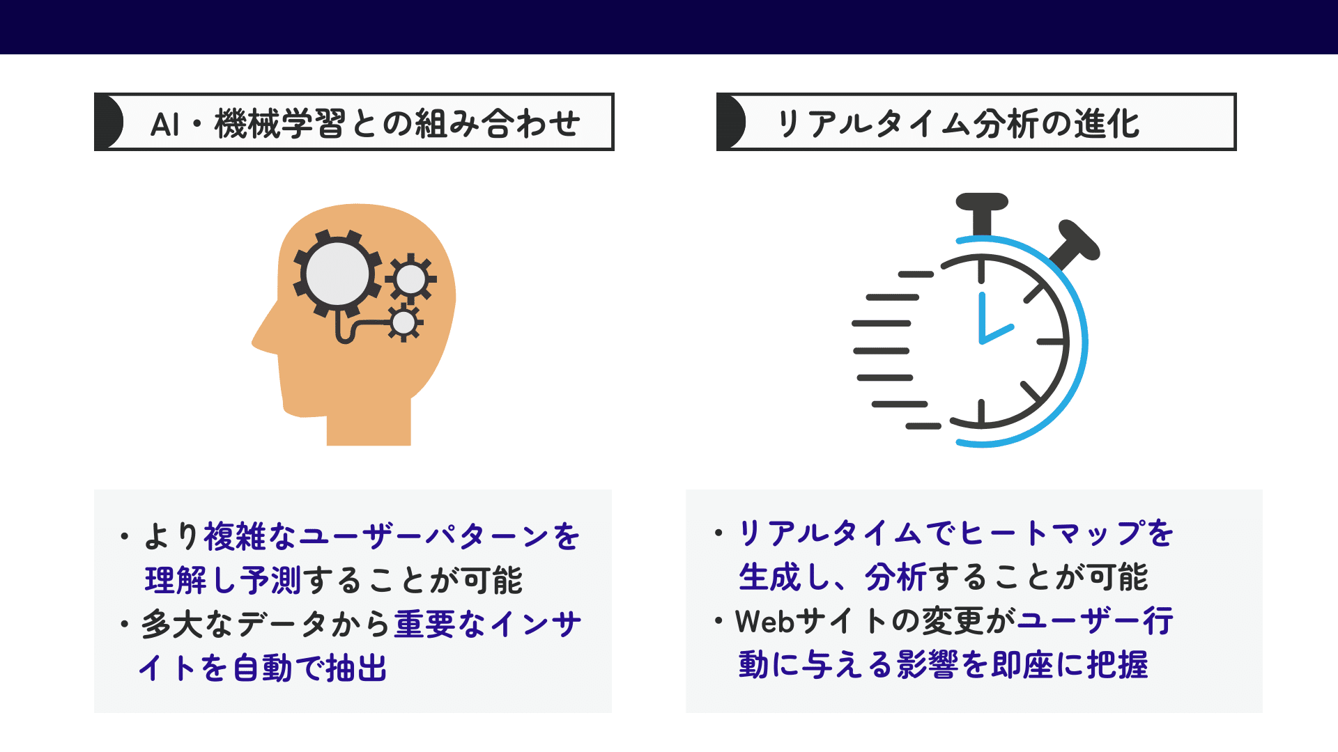AIや機械学習技術の技術がヒートマップ分析に組み込まれることで、多大なデータを高速に処理し重要なインサイト(ユーザーの隠れた心理)を自動で抽出できるようになります。これにより、ユーザー行動の予測や改善策の提案が自動化され、効率的なWebサイト運営が可能となります。