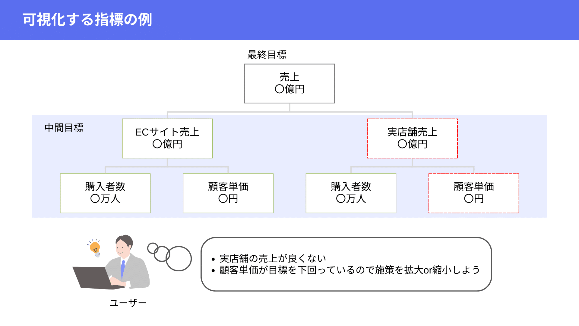 大きな目標を評価する指標だけだと、値を見て次のアクションを決定することが難しくなります。アクションに繋げやすくするために細分化した指標を可視化しましょう。