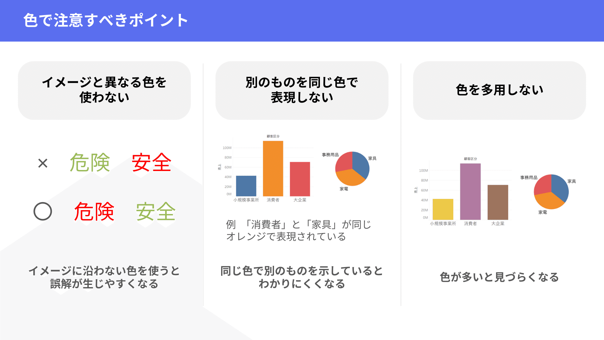 最後に、使う色は3色程度にするとまとまりやすくなります。もし色が多くなってしまうときは、注目したいデータ以外を灰色にすると良いでしょう。