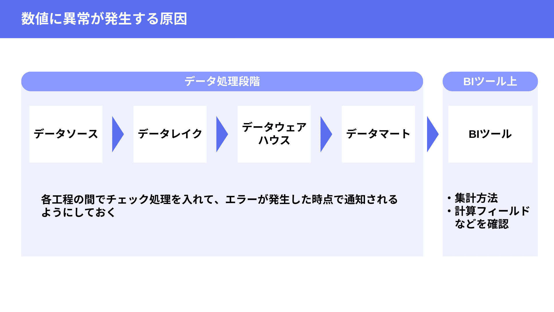 表示している数値が正しくないと信頼できないダッシュボードになってしまいます。数値の異常が発生する原因は、データ処理段階で起こるものとBIツール上で起こるものがあります。