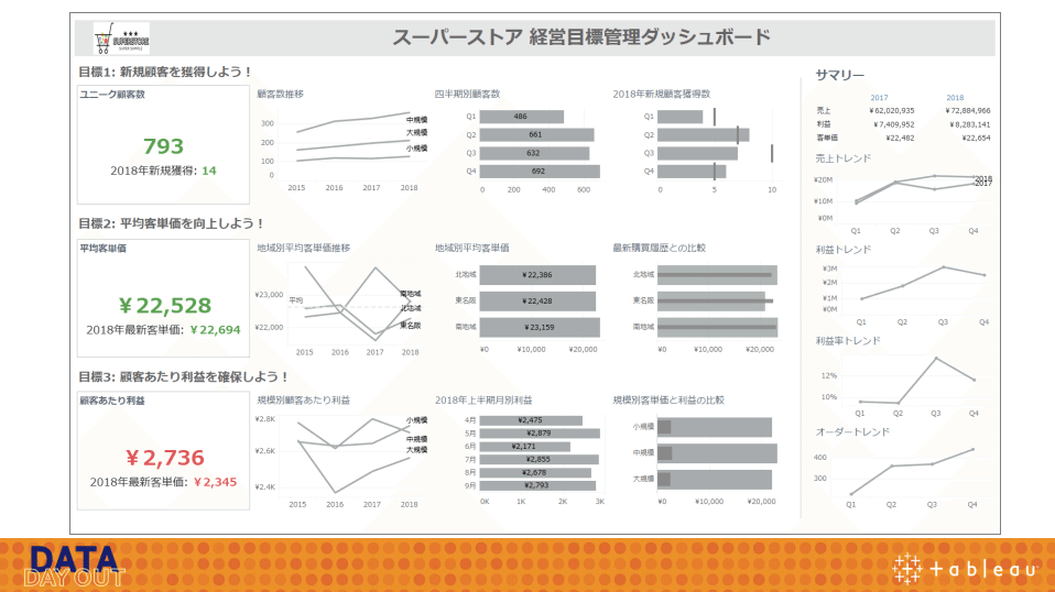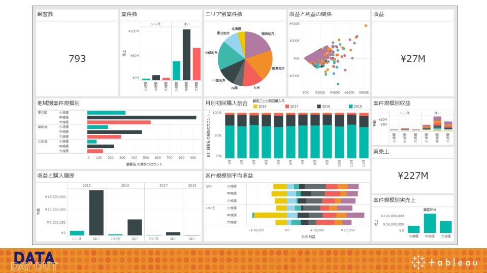 ダッシュボードとは、簡単に言うと、様々なグラフや表など複数の情報を一つの画面に入れたものです。ビジネス上では、ダッシュボードの作成にTableauなどのBIツールがよく使用されています。