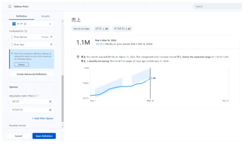 このようにTableau Pulseが代わりに売上状況や予測値を比較します。