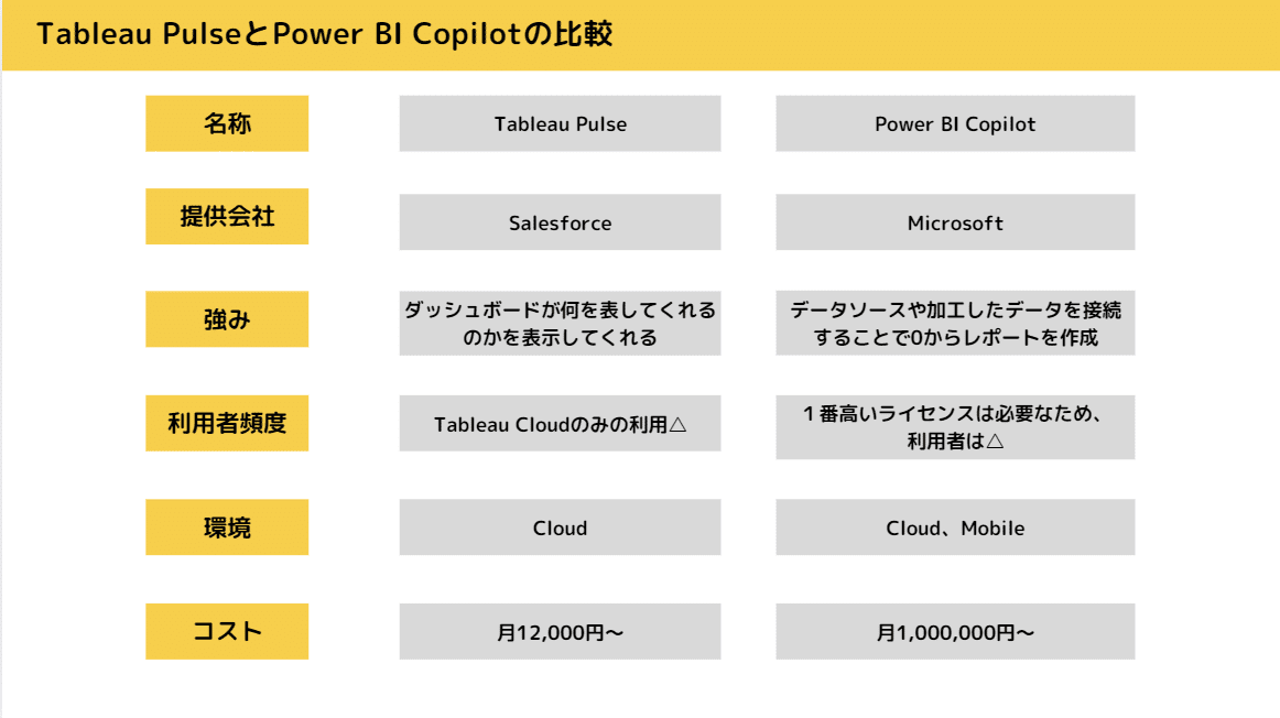 Tableau PulseとPower BI Copilotの2つのツールを比較してみました。